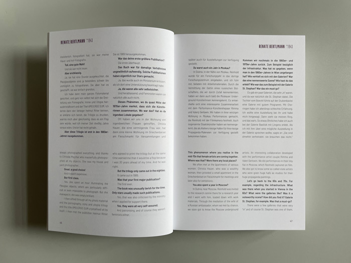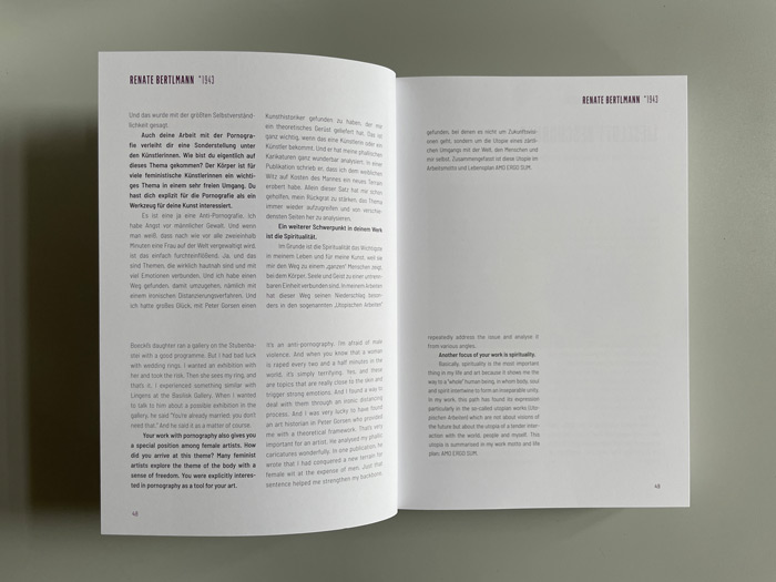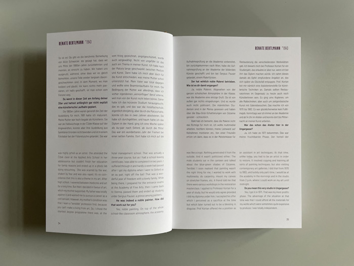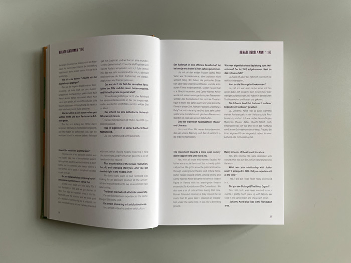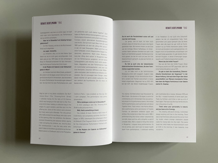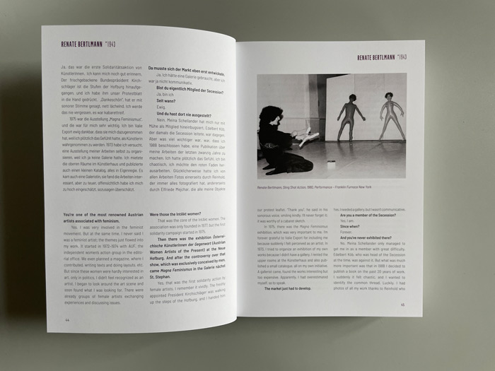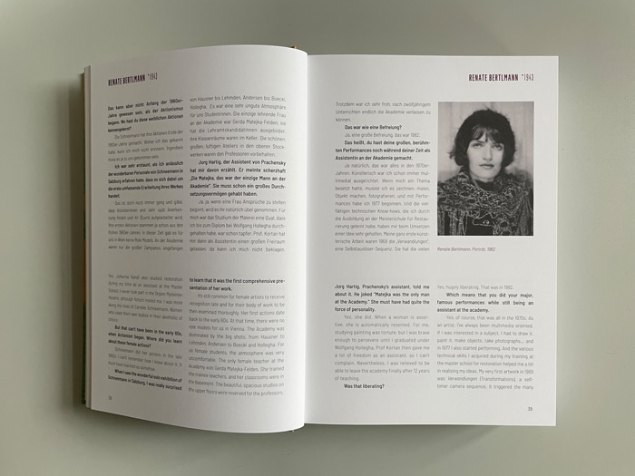 Gespräche mit Renate Bertlmann, Linda Christanell, Inge Dick, Valie Export, Gerda Fassel, Isolde Maria Joham, Birgit Jürgenssen, Angelika Kaufmann, Kiki Kogelnik, Friedl Kubelka, Maria Lassnig, Marianne Maderna, Florentina Pakosta, Helga Philipp, Margot Pilz, Elfie Semotan, Linde Waber u. v. a.